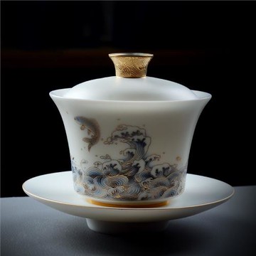 羊脂玉瓷蓋碗手工描金敬茶杯德化白瓷三才碗家用大茶碗純色小清新