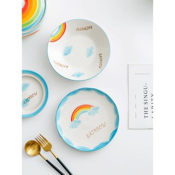 北歐家用陶瓷米飯碗帶蓋湯面碗碟盤子套裝卡通深湯盤圓形平菜盤