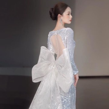 長袖禮服氣質輕奢名媛年會主持連衣裙露背修身魚尾亮片新娘輕婚紗