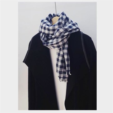 日系外貿W單 清新藍白格子男女棉麻圍巾顯白文藝百搭秋冬格子披肩