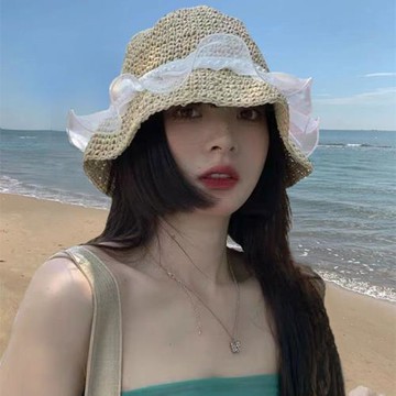 點我下載法式仙女蕾絲珍珠荷葉邊漁夫帽女夏海邊遮陽防曬草帽可折疊草編帽