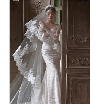婚紗禮服影樓主題服裝新款攝影拍照藝術照魚尾超仙蕾絲重工白色