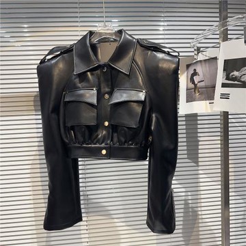 網紅同款2025秋季新款炸街款口袋墊肩辣妹水洗皮PU皮衣皮夾克外套