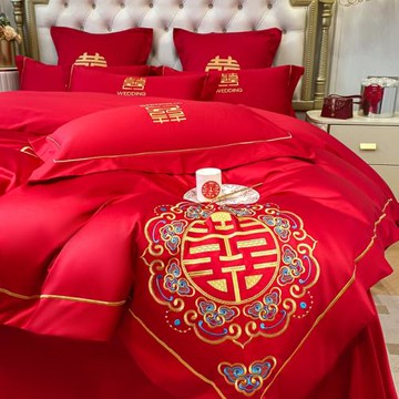 高檔160s結婚四件套大紅色床單龍鳳刺繡被套純棉喜被婚慶床上用品