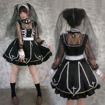 點我下載成人大裙擺秋季修女服萬圣節cos服哥特風少女鏤空蕾絲大碼連衣裙