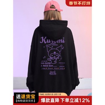 庫洛米衛衣原創小眾設計女秋冬季黑色加絨加厚連帽美式慵懶風上衣