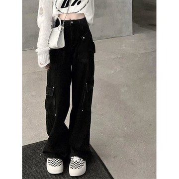 特大碼300斤美式復古黑色牛仔褲女春夏款小眾潮牌直筒工裝闊腿褲