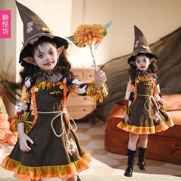 萬圣節兒童稻草人cos服舞臺表演服南瓜魔法師女巫服小丑女連衣裙