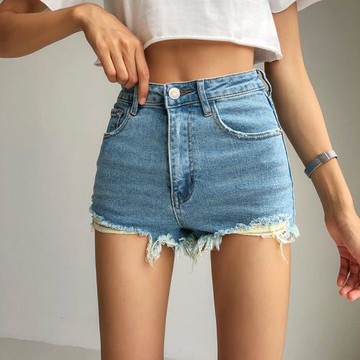 高腰純棉A字鬚邊牛仔短褲
