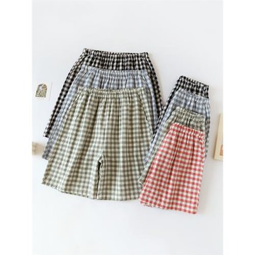 日系小格情侶睡褲女夏短褲薄款純棉三五分半褲家居褲大褲衩男外穿