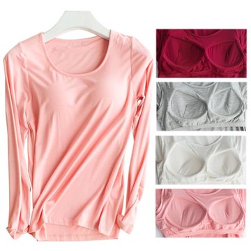 帶胸墊睡衣上裝長袖T恤女上衣純色棉質文胸罩杯一體莫代爾打底衫