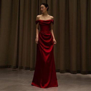一字肩敬酒服高端輕奢新娘訂婚連衣裙2025新款小拖尾顯瘦緞面禮服