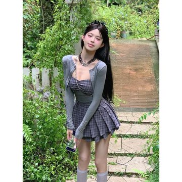 【下周六】女夏氣質辣妹深灰色鏤空上衣+格子吊帶+甜妹裙子套裝裙