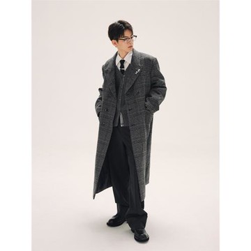 HTCU 克利夫頓 廓形剪裁格紋毛呢中長款大衣呢子風衣外套男