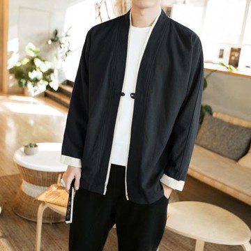 JANWONG原创棉麻条纹不规则拼接kimono道袍男7分袖补丁夹克外套