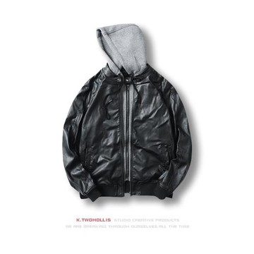 點我下載假兩件皮衣外套男新款秋冬新款黑色連帽大碼寬松休閑皮夾克上衣潮