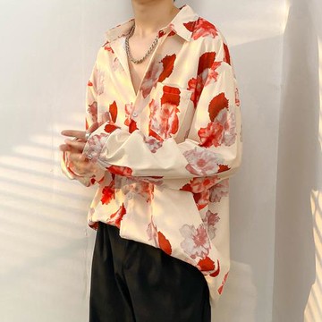 發型師潮牌男裝高級墜感襯衫男ins痞帥雪紡花襯衣長袖夏威夷外套
