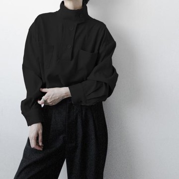 春夏新款 100%棉 立領寬松廓形 口袋 長袖白襯衫