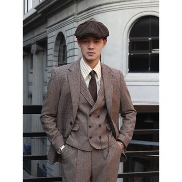 復古英倫雅痞謝爾比浴血黑幫風羊毛粗花呢人字紋修身西服三件套裝