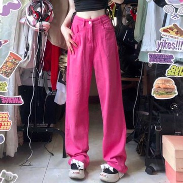 美式復古粉色牛仔褲男女小眾寬松直筒中腰顯瘦bf拖地哈倫工裝長褲