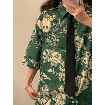 港風復古夏威夷滿印短袖vintage花襯衫男女泰式雅痞情侶沙灘襯衣