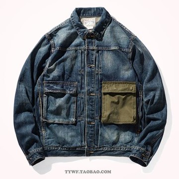 牛仔外套男復古工裝夾克撞色拼布阿美咔嘰重磅美式休閑翻領牛仔衣