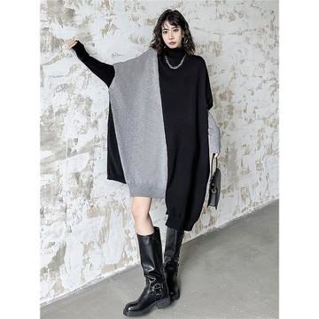 點我下載長裙女2026春季新款港風小眾撞色拼接高領針織裙寬松過膝毛衣裙子