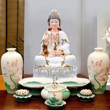 家用佛堂供具佛菩薩陶瓷彩繪浮雕蓮花香爐供盤供水杯花瓶燭臺整套