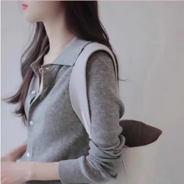 通勤百搭POLO領羊毛針織衫女春秋翻領寬松顯瘦襯衣韓版打底襯衫