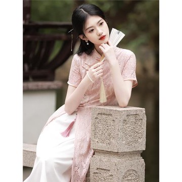 年輕款溫婉溫婉系粉色奧黛改良旗袍2025年夏季新款氣質高端日常裝
