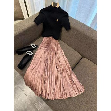VANLU 三宅褶皺系列!文藝復古氣質 珠光光澤高腰A字中長款半身裙