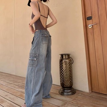 GYOKUU 藍色中低腰夏季工裝薄款牛仔褲直筒褲長褲女春夏