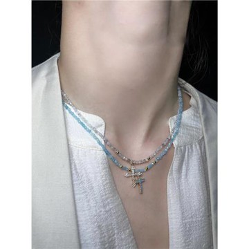 925鍍18k金海藍寶天然水晶石碧璽串珠疊戴十字架細吊墜鎖骨項鏈女