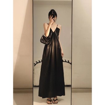 赫本風小黑裙子質感高級感氣質紋理垂感黑色V領吊帶連衣裙女秋季