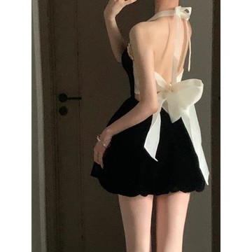 訂婚生日小禮服裙高端輕奢小眾高級感別致漂亮黑色掛脖吊帶連衣裙