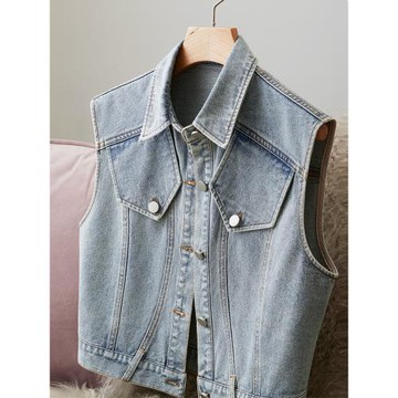 設計感個性時尚西裝領雙口袋工裝牛仔無袖背心馬甲短款外套上衣女