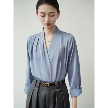 ACHU 從容簡約 藍色V領緞面襯衫女寬松套頭襯衣日常通勤職業上衣