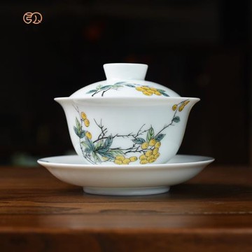 羊脂玉瓷蓋碗寶石黃描金三才碗陶瓷手工貼花泡茶杯家用大容量茶碗