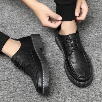 休閑皮鞋男夏季商務正裝透氣高級感英倫風方頭黑色厚底真皮大頭鞋