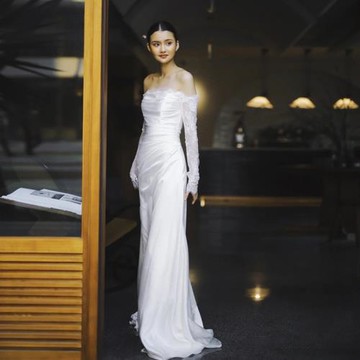 點我下載長袖一字肩輕婚紗氣質復古緞面蕾絲森系超仙新娘訂婚結婚迎賓禮服