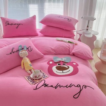 PINK粉色可愛熊加厚牛奶絨四件套法萊絨床單被套卡通保暖床品高級