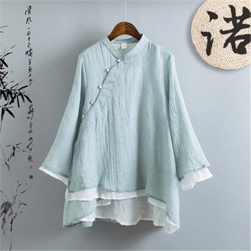 清裊中國風立領斜襟雙層棉麻薄紗寬松上衣女珍珠扣亞麻襯衫禪茶服