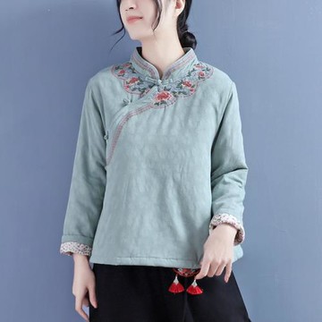 2022冬季棉麻領口繡花立領斜襟盤扣棉服女中國風復古文藝中式棉襖