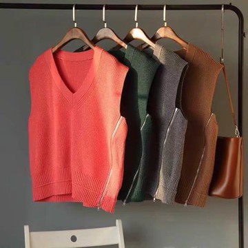 點我下載春秋新品V領無袖針織背心馬甲女裝上衣拉鏈裝飾純色外搭