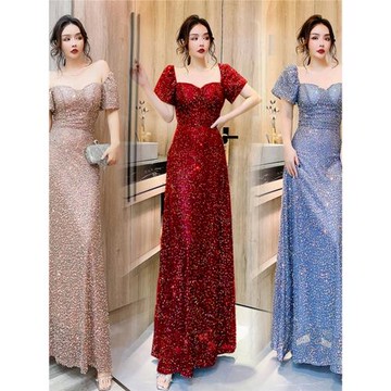 亮片晚禮服裙女2025新款輕奢小眾高級感一字肩宴會年會氣質主持人