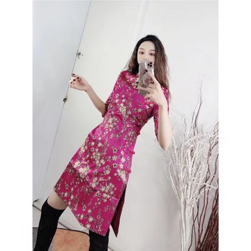 旗袍刺繡玫紅色亮絲提花復古中國風修身小個子春秋國潮名媛氣質女
