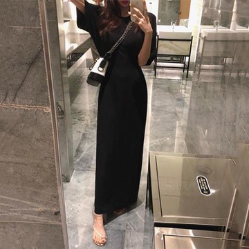 索如彤夏季圓領短袖黑色長款連衣裙氣質修身莫代爾收腰長裙到腳踝