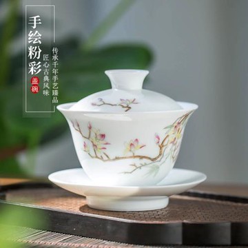喜上眉梢羊脂玉懸停蓋碗茶杯德化白瓷茶碗帶蓋三才大功夫家用茶具