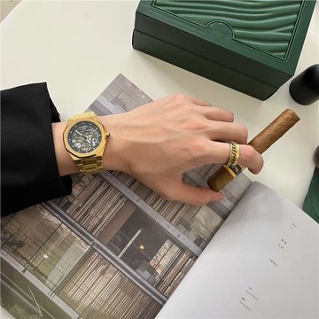 八角方形手表男鋼帶休閑復古土豪金鏤空夜光商務個性嘻哈小金表潮