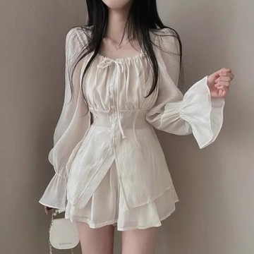 韓國chic夏季法式氣質系帶褶皺喇叭袖防曬襯衫+高腰闊腿短褲套裝